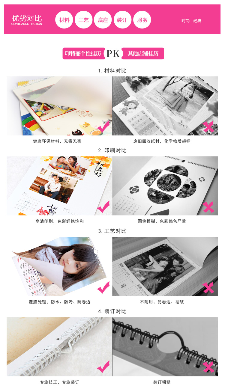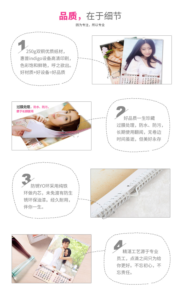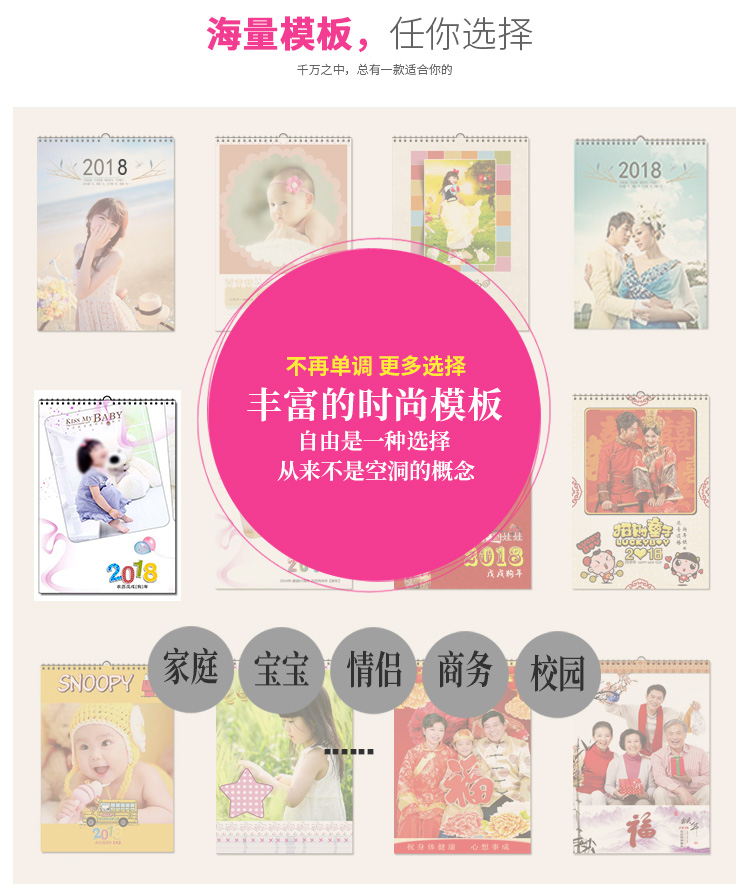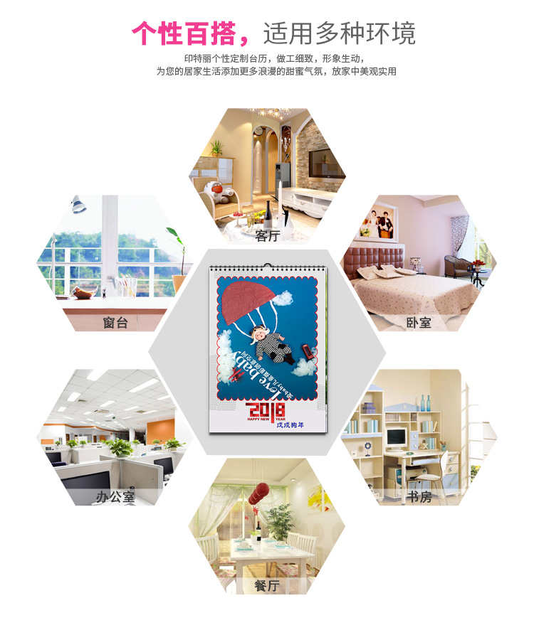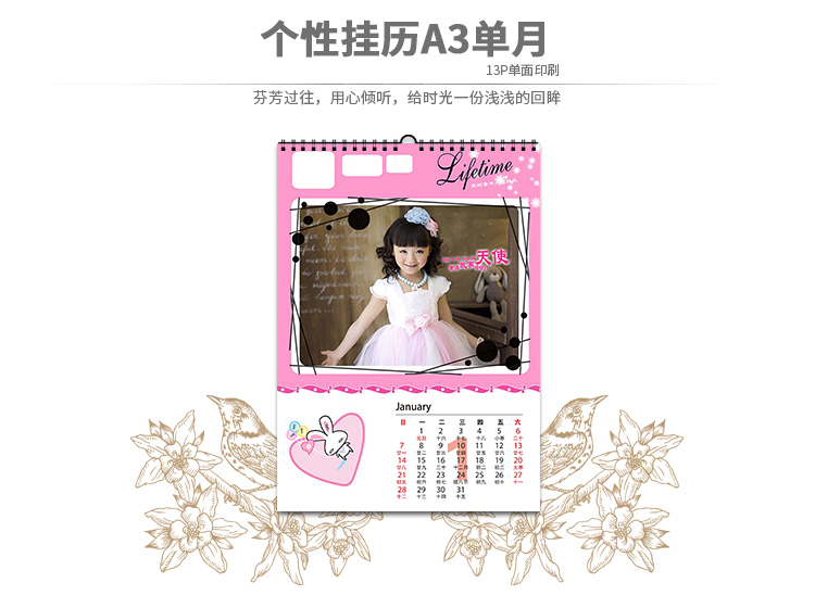 掛歷12個(gè)月具有12張不同的畫面,而且畫面美觀大方,月月給人一種新鮮感,客人來了往往翻一翻,欣賞一番,贊美一番,不僅使客人享受了“美”,而且也使主人心里美滋滋的。將家人的照片制成掛歷,這既是有意義的紀(jì)念品,也是一份時(shí)尚的禮品。掛歷不僅是一種日期提示和查詢工具,它也演變成一種家里裝飾角色。為消費(fèi)者“量身定制”新年掛歷、臺(tái)歷的無論內(nèi)容,還是形式,都可以按照消費(fèi)者的要求來專門制作,不僅實(shí)用,最重要的是包含在里頭的濃濃情意和無限甜蜜。
