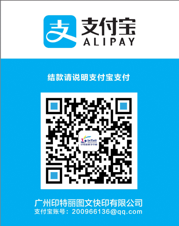 預(yù)存、支付寶或微信轉(zhuǎn)帳(付款后正式安排生產(chǎn))。 支付寶帳號(hào):200966136@qq.com 用戶名:廣州印特麗圖文快印有限公司
